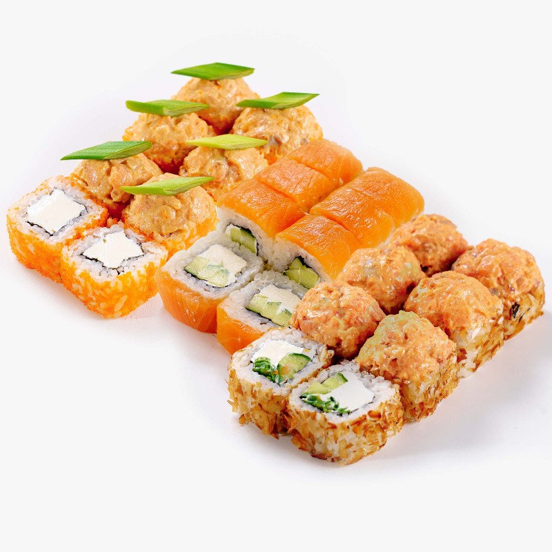 Нежный творожный сыр дополняется икрой масаго, а шапочка из лосося и соуса спайси придаёт приятную остроту. Зелёный лук добавляет свежести и сочности.
